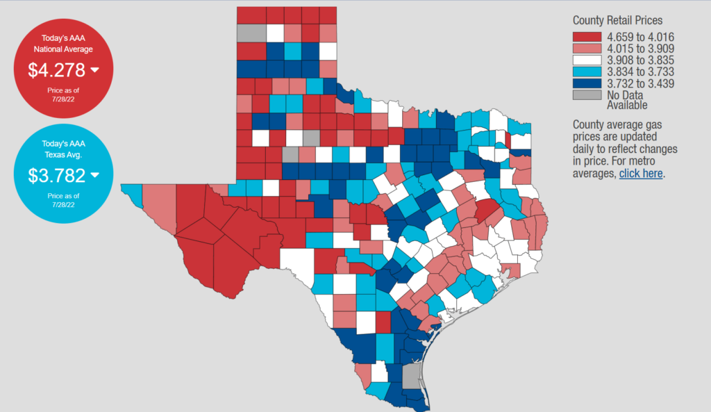 То, что в Техасе самый дешевый бензин в США – это неудивительно, так как в этом штате добывают нефть. Поэтому, по этому штату можно вычислить минимальную стоимость в Америке, вот как распределяется стоимость по штату Техас: