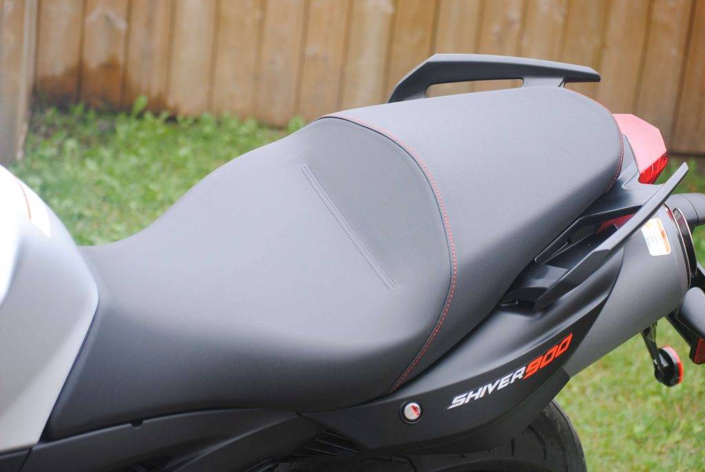 The seat is reasonably comfortable and just under 32 inches high. Along with the upright ergonomics, it makes for an easy-to-ride motorcycle, though I wouldn’t call the Shiver a beginner bike, by any means. Photo by Kevin Wing.