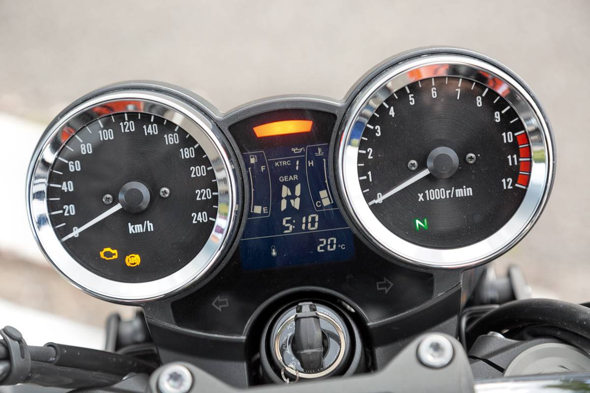 While the engine and electronic rider aids are the most substantive changes, the most visible upgrade to the Shiver 900 is the TFT full-color dash. The display includes a bar graph tachometer across the top. Below that are displays for speed, gear indicator, engine temperature, the ride mode and traction control level you’ve selected, and other information you can scroll through using the controller on the left side of the handlebar.