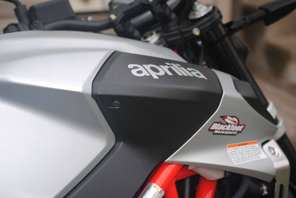 An option is the Aprilia Multimedia Platform, which lets you tie your Bluetooth device into the dash so you can control your phone or helmet communicator through the handlebar-mounted switch. There’s a row of small icons across the bottom of the TFT display for that function.
