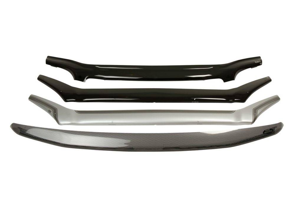Мухобойка на капот (так еще называют дефлектор) продается в нескольких вариантах исполнения. На прилавках магазинов можно отыскать дымчатые, тонированные или карбоновые устройства. Деталь направляет от автомобиля движущиеся воздушные массы, возникающие в районе передних фар авто и направляющиеся вдоль капота к лобовому стеклу. Осуществляя выбор ветровика, его прикладывают к кузовному элементу. Это необходимо для того, чтобы удостовериться в наличии необходимого для продувания промежутка между поверхностью капота и дефлектором.