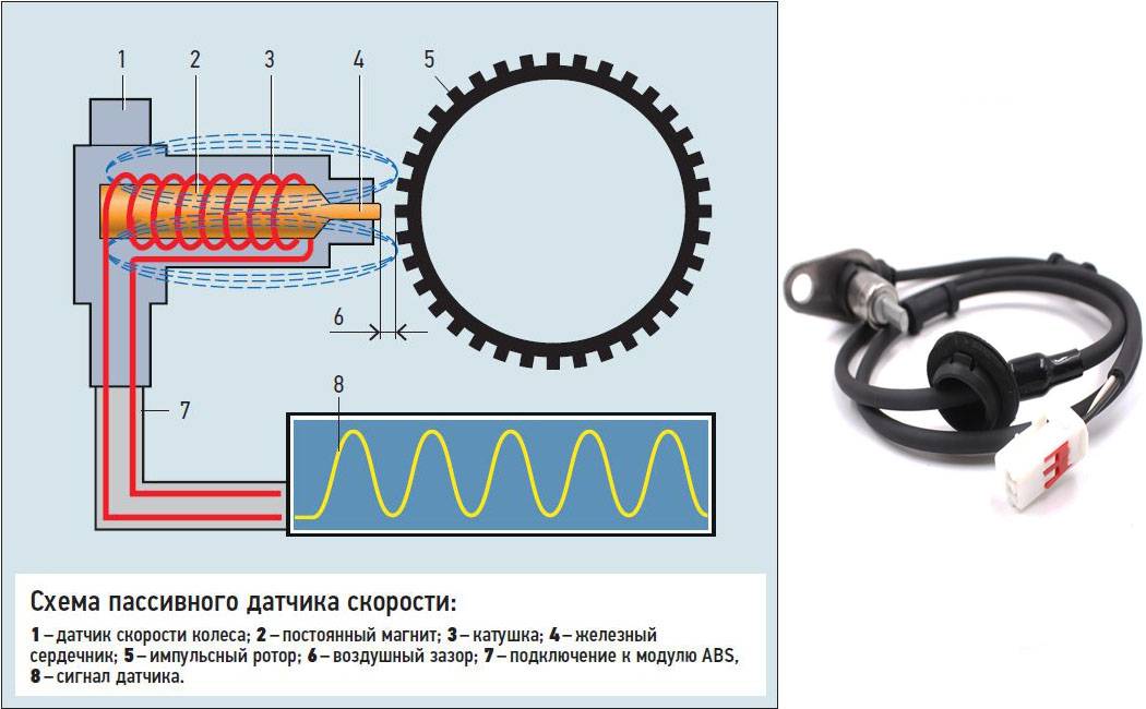 В конструкции АБС используется два типа датчиков. Первые получили название пассивных датчиков. Эти элементы – индуктивного типа.