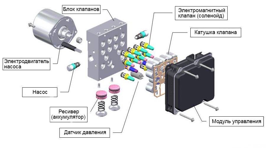 Устройство антиблокировочной системы состоит из трех основных составных элементов: