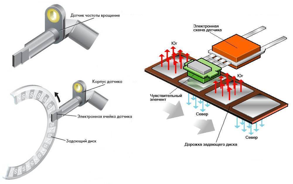 Суть работы активных элементов различная. В магниторезистивном варианте постоянно меняющееся поле (от задающего кольца) приводит к изменениям показаний сопротивления в датчике. В элементе Холла это поле меняет само напряжение. В обоих случаях создается импульс, по которому можно рассчитать скорость вращения.