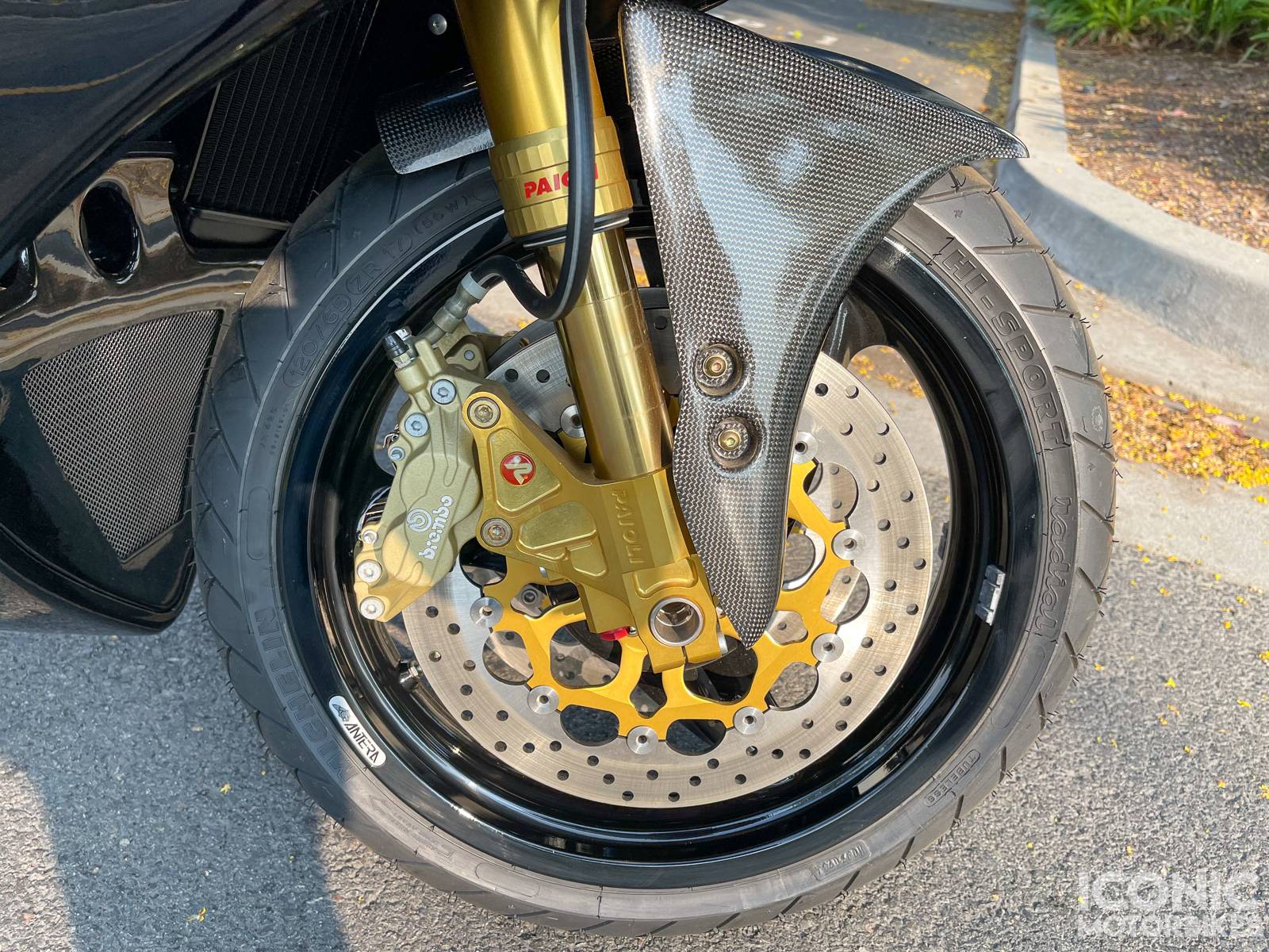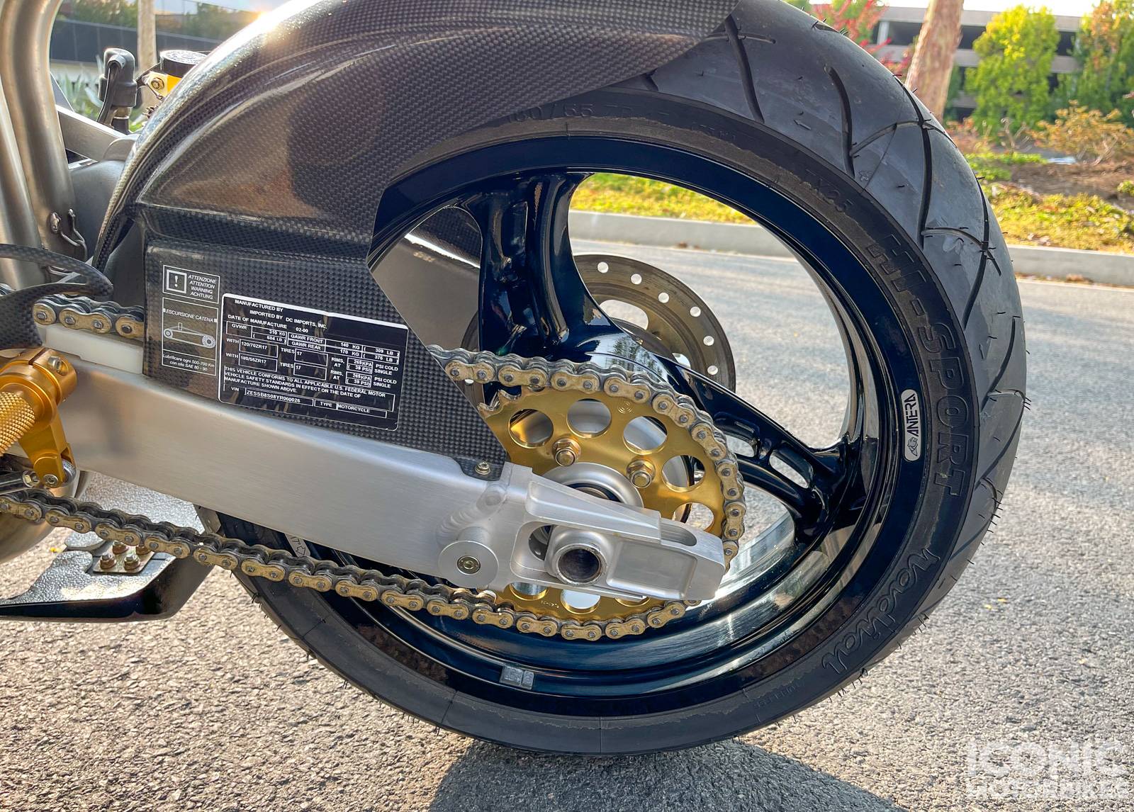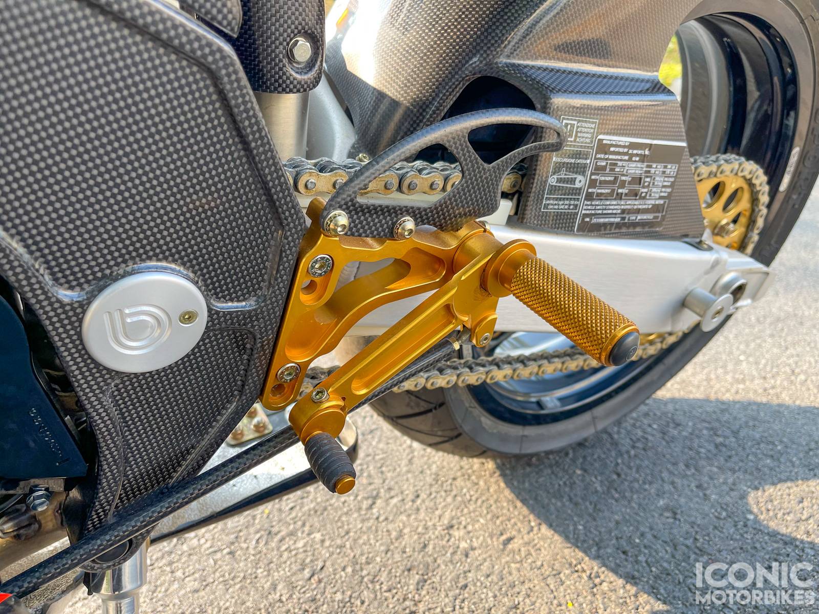 Other distinguishing features of the Special included blacked-out rims, a carbon fiber gear shift rod, Ergal engine screws, gold-anodized adjustable billet rearsets and brackets (with carbon heel guards), and a gold-anodized aluminum chain sprocket.