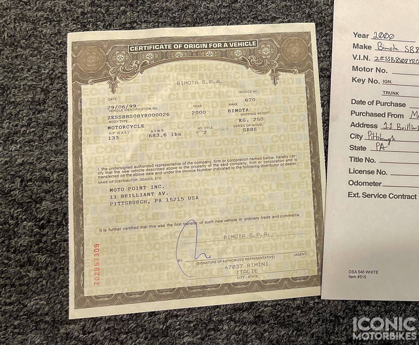 Currently located at our facility in Santa Monica, California, this Bimota is offered with the MSO as it has never been titled or registered. The MSO was assigned to Moto Point in Pittsburgh, Pennsylvania.