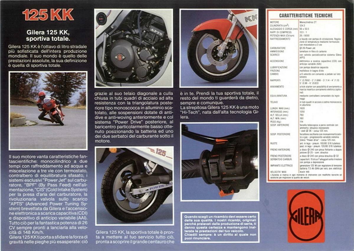 Nell’agosto del 1987 la rivista Moto Sprint mise a confronto, in una delle “folli” comparative organizzate da Claudio Braglia, sette Gilera 125, praticamente tutto il listino delle ottavo di litro della Casa di Arcore, che comprendeva le enduro RC 125 Rally, ER 125, RRT 125 Nebraska, la “motard” Fastbike e ovviamente la KZ, anche in versione Endurance, e la KK. I dati rilevati all’epoca furono ovviamente molto vicini a quelli reali, ma sempre di poco superiori, il contrario di quanto avveniva sempre quando si testava al banco o in pista una moto.