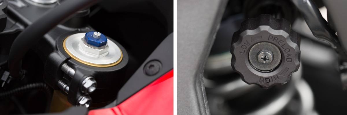 The engine is held in a steel semi-double cradle frame that has been designed with mass centralization in mind; for example, the battery and the ABS unit are packaged at the rear of the cylinder that helps contributes to a low center of gravity.