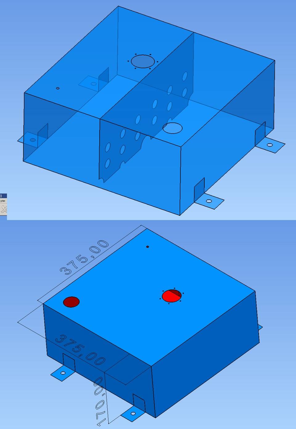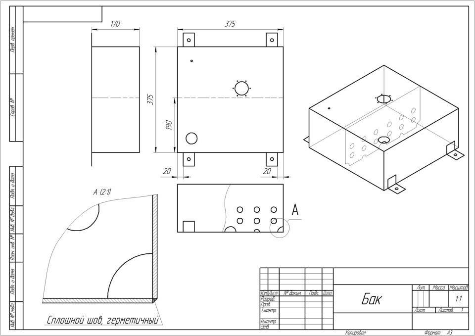 Имея высоту, и требуемый объем вычисляем размер стенок, получается 375х375.У родственника, на производстве которого происходила сварка узнали диаметры труб из нержавейки в наличии, для изготовления отверстия под горловину, так-же закладываем отверстие под доступ воздуха. Производим обмер крепежных и присоединительных размеров топливозаборника. Проектируем внутри переборку для противоотлива топлива, по крайней мере, такой она мне привиделась.