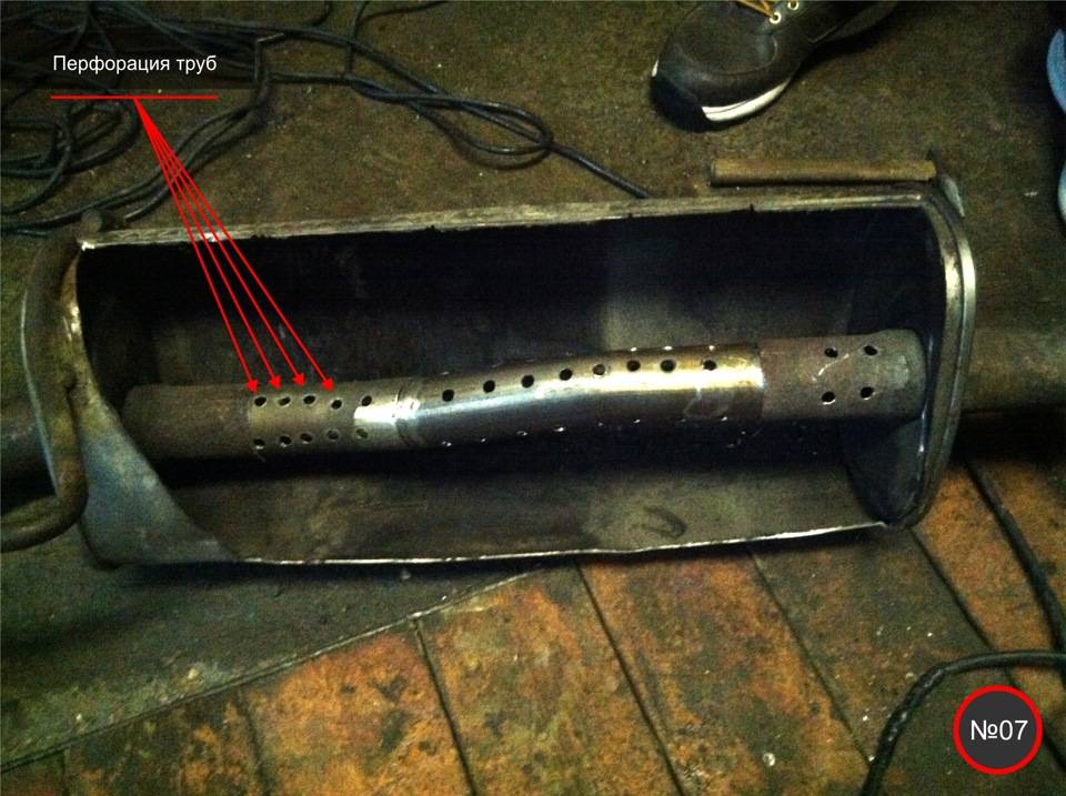 Осталось выкроить сам корпус— будет ли он цилиндрическим либо приплюснутым, зависит только от вашего желания. Минимальный диаметр корпуса равен 100 мм, однако при возможности он должен равняться 150–170 мм. Боковины корпуса изготавливаются из аналогичного листового металла, после чего в них проделываются отверстия для труб. Первая и вторая труба, описанные выше, обрабатываются, после чего на них должен образоваться фланец, позволяющий прочно закрепить их внутри глушителя. В третьей трубе нужно просверлить множество отверстий — оптимальным вариантом будут дырочки диаметром 1 мм с шагом в 10–15 мм, после чего вставить её внутрь корпуса и надёжно закрепить между первой и второй.