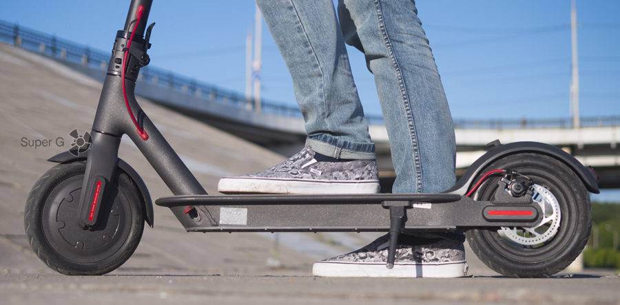 На Mijia M365 и с моим лаптями 45-ого размера мне очень комфортно. Есть даже место для ещё одной, третьей стопы. Так, что при желании на самокате можно даже слегка потоптаться. Девочки смогут даже походить взад-вперёд.