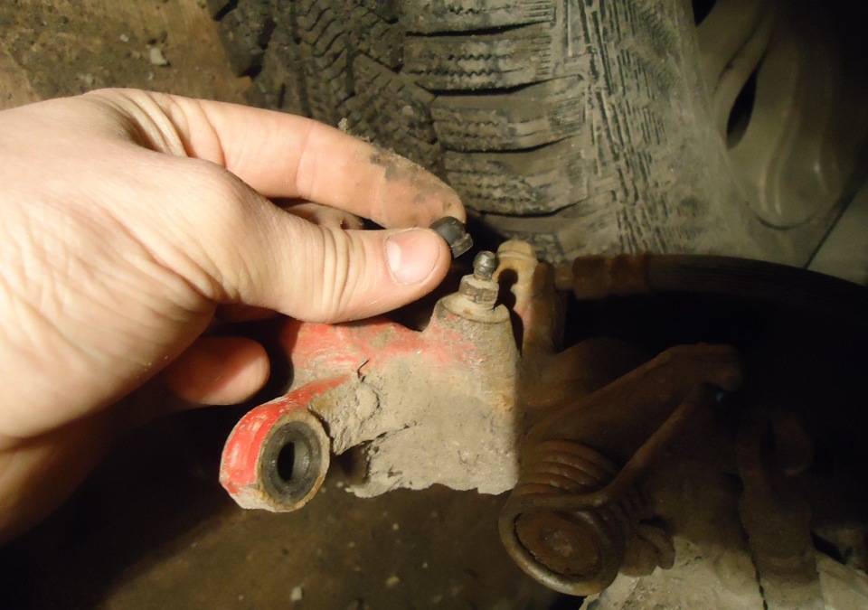 - надеть шланг на штуцер тормозного цилиндра, расположенного за колесом (другой конец опустить в ранее заполненную тару);