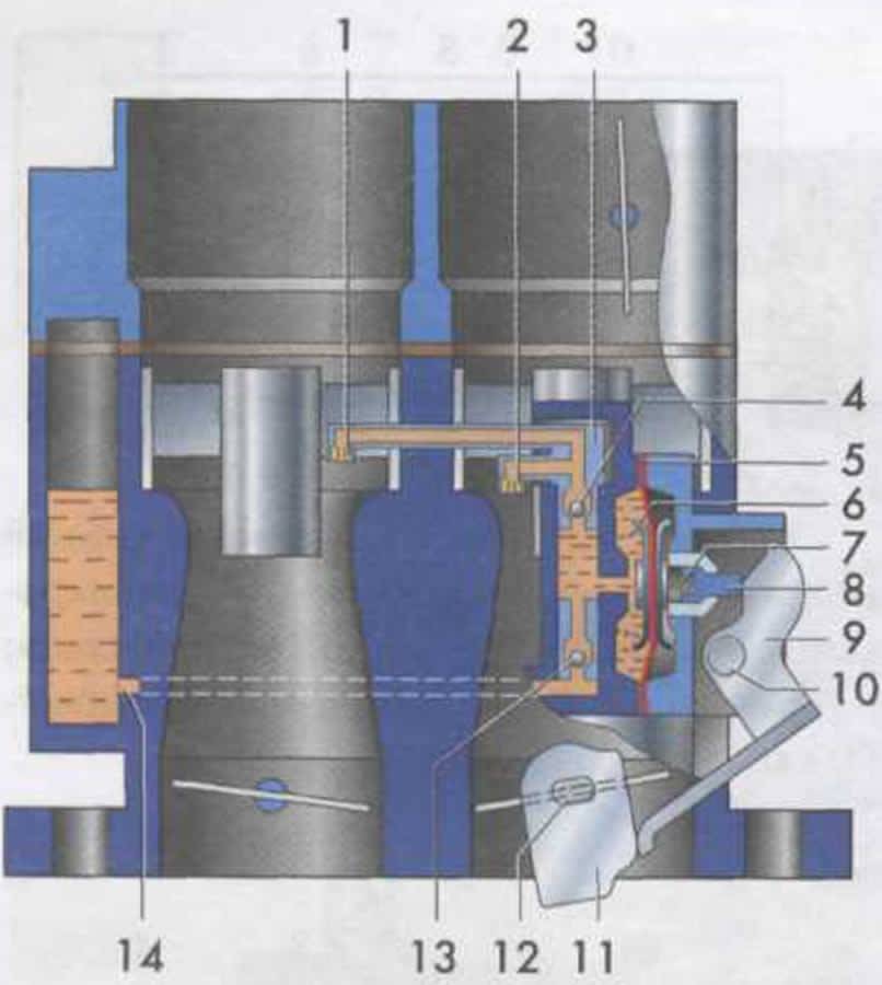 Ускорительный насос: 1 — выходное отверстие распылителя во второй камере; 2 — выходное отверстие распылителя в первой камере; 3 — распылитель; 4 — шарик нагнетательного клапана; 5 — диафрагма; 6 — возвратная пружина диафрагмы; 7 — пружина толкателя; 8 — толкатель; 9 — рычаг; 10 — ось рычага; 11 — кулачок; 12 — ось дроссельной заслонки первой камеры; 13 — шарик всасывающего клапана; 14 — канал подвода топлива из поплавковой камеры.