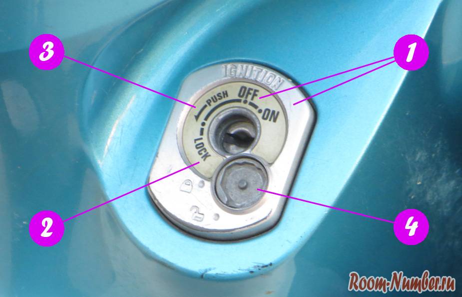 - Сначала нужно завести скутер. Садимся на байк, убираем подножку, вставляем ключ в замок и поворачиваем вправо. На спидометре должна загореться лампочка (если она есть). Подробнее о манипуляциях с ключом зажигания на схеме ниже.
