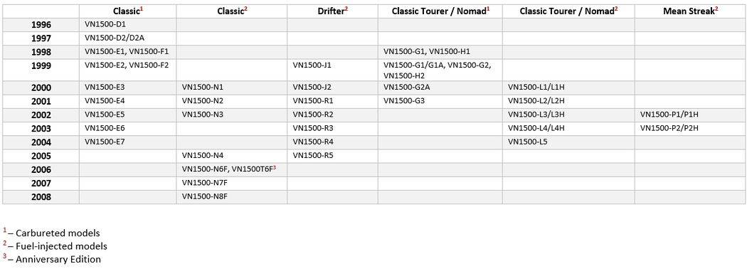 Модель: Kawasaki VN1500 Vulcan Classic (Fi), Kawasaki VN1500 Vulcan Classic Tourer (Fi) / Nomad, Kawasaki VN1500 Drifter (Япония, Европа, Северная Америка). Заводское обозначение: VN1500-E3, VN1500-L1, VN1500-G2A, VN1500-N1, VN1500-J2.