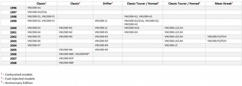 | 2003 | Japan, North America | Name: Kawasaki VN1500 Vulcan Classic (Fi), Kawasaki VN1500 Vulcan Classic Tourer (Fi) / Nomad (Fi), Kawasaki VN1500 Drifter, Kawasaki VN1500 Mean Streak Code: VN1500-E6, VN1500-L4, VN1500-R3, VN1500-P2 |