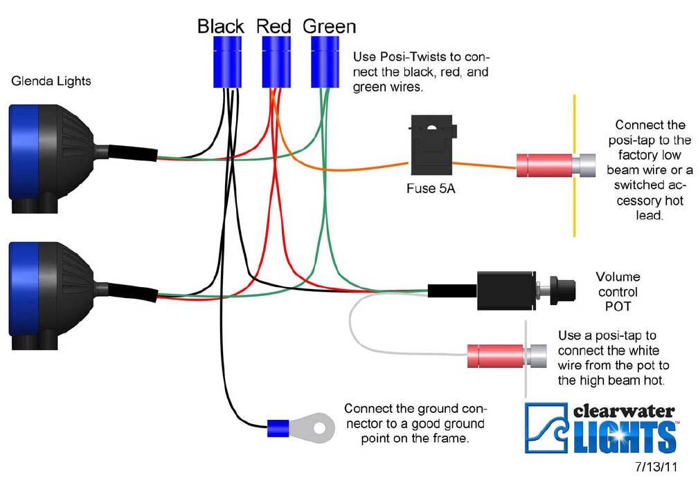 - Use a posi-twist to connect the green wire from the pot to the two green wires from the lights (3 wires) Please note the Tenere will require the provided wire extensions for Glenda.