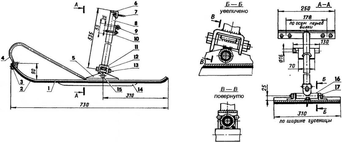 Чтобы лыжи свободно поворачивались, к ним приваривают металлические стойки из труб. В рабочем состоянии они держатся в передних втулках рамы, где легко вращаются.
