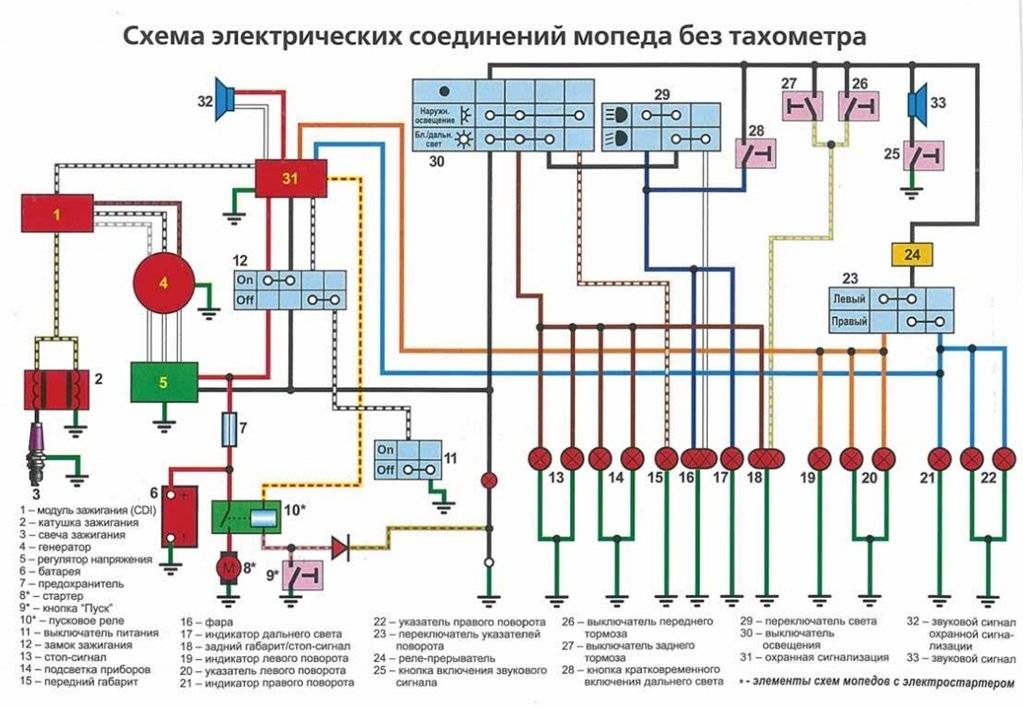 Видео в этой статье даст информацию относительно обслуживания схожих моделей. Для изделий с панелью приборов, содержащей тахометр, публикуем часть схемы, имеющей различия и в органах управления. В этом случае проводка на мопед Дельта дополнена несколькими элементами для подключения.
