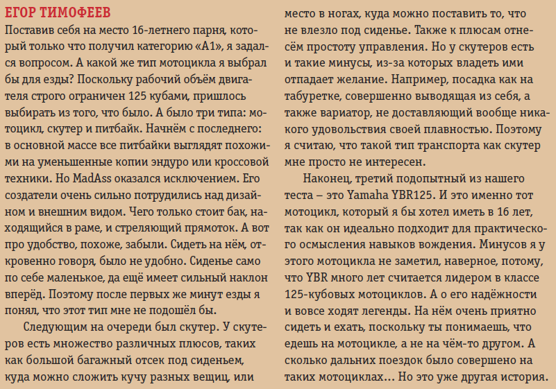 Если вам нужна весёлая игрушка, то MadAss– очень интересный вариант. У него есть все отличительные черты питбайка: злость, звук, хорошие тормоза, проходимость и малый вес, но в дополнение к этому он может легально эксплуатироваться на дорогах общего пользования. Если нужно просто средство транспорта для поездок на учёбу/работу, то тут скутеру равных не будет. И рюкзак с учебниками и тетрадями, положенный «в унитаз», всегда будет оставаться чистым и сухим. А вот если нужно универсальное средство транспорта, на котором и по городу, и на дачу, и к морю с девушкой, то тут конкурентов не будет уже у мотоцикла.