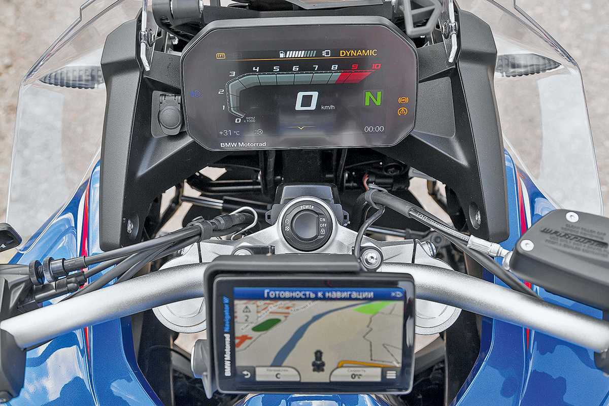 Модель оснащена множеством передовых технологий из арсенала баварского концерна. Так, TFT-приборная панель является маршрутным компьютером, навигатором и мультимедийной системой. В ней множество различных менюшек и разделов, можно подключить телефон, гарнитуры, которые синхронизируются с приложением в телефоне, что позволяет слушать музыку или принимать звонки. С помощью того же приложения для смартфона можно вывести на экран навигационную информацию в виде стрелочек. Очень порадовали дисплей и графика панели: как я ни пытался найти такой угол обзора, чтобы экран не читался при ярком солнце, как ни крутил мотоцикл, ничего у меня не вышло.