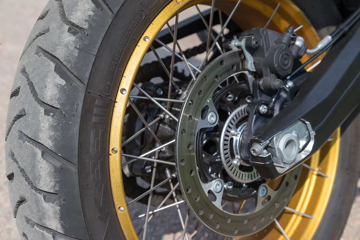 Тормозная система BMW F750GS от Brembo осталась прежней, но установлена она на другие колёса. В то время как более крупный и внедорожный F850GS имеет спицованные колёса, на 750-ке установлены литые диски. Размер задней резины на обоих байках составляет 150/70R17, при этом переднее колесо 750го имеет более дорожный размер 110/80R19. На моём экземпляре стояли Bridgestone Battlax Adventure A41, неплохие дорожные шины, но не лучшие для грязи и песка.