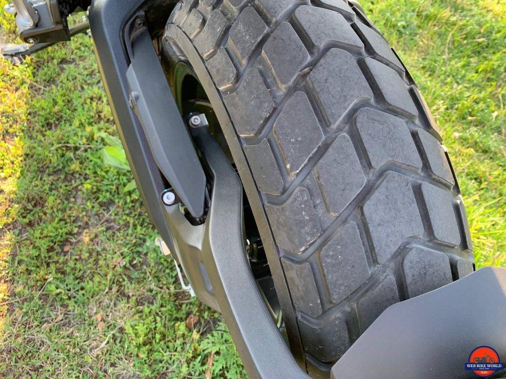 Tubeless cast wheels are shoed with Pirelli MT 60 RS tires – enough tread to take on gravel roads while smooth enough for a nice ride on pavement.