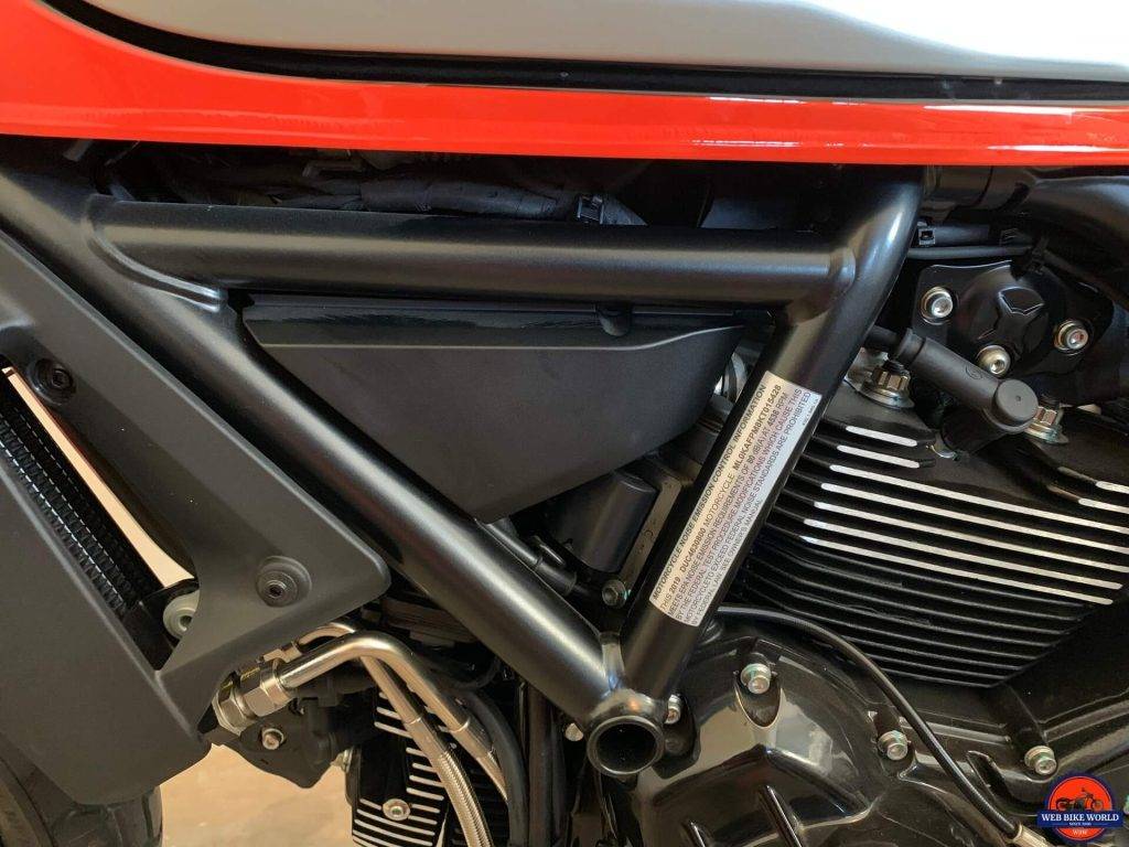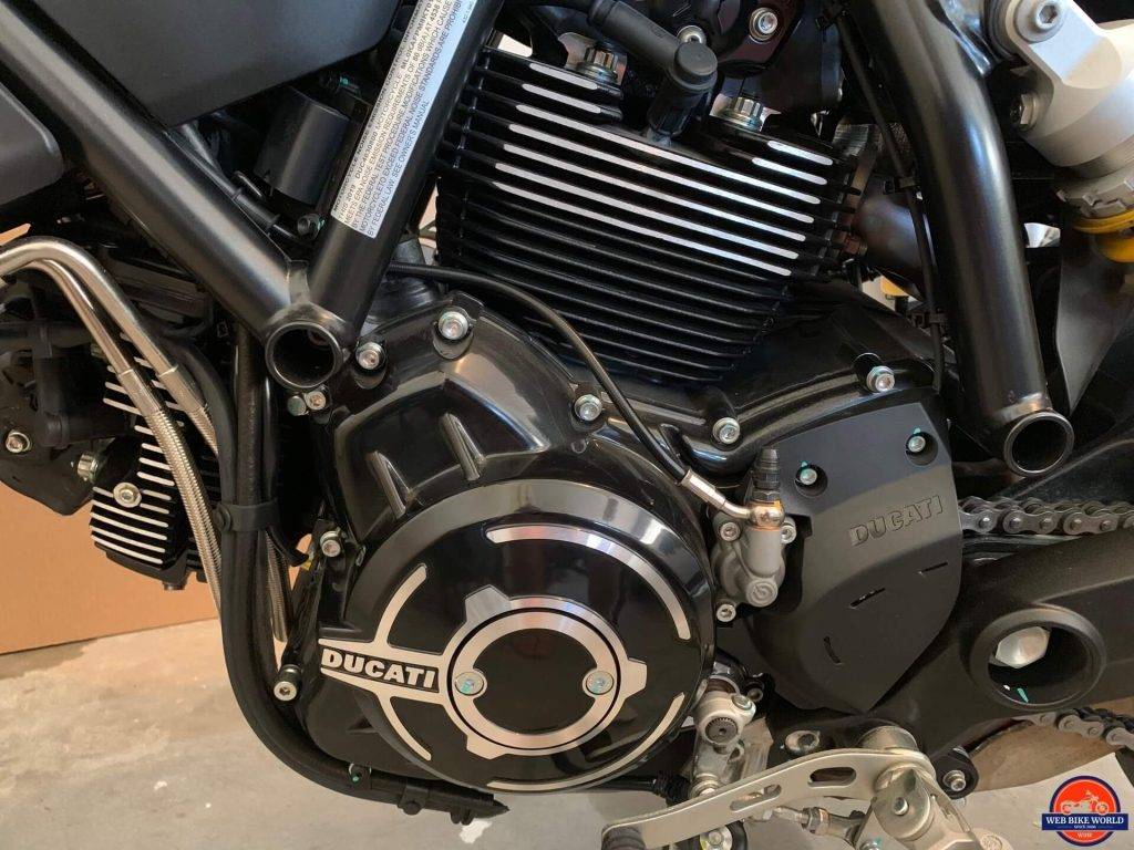 The Scramblers 803cc Desmo L-twin engine has machined fins this year