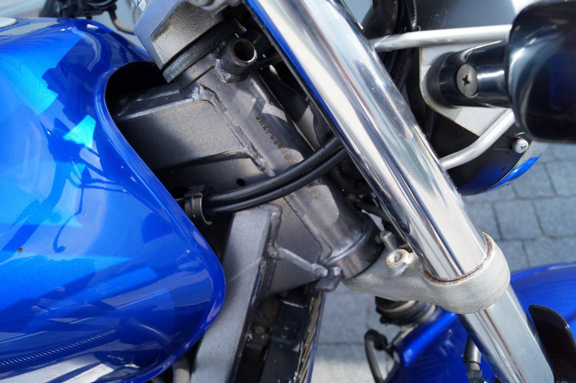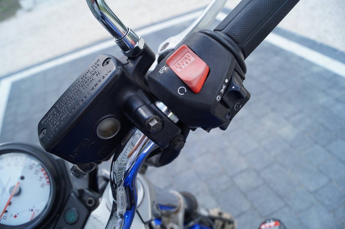 - Как и положено нейкеду — передний обвес у байка отсутствует. Головная оптика представлена одной большой фарой неправильной формы (в последних версиях — круглой). Она на кронштейнах установлена на передней вилке. Благодаря небольшой декоративной крышке, прикрывающей её сверху, панель приборов выглядит единым целым с ней.