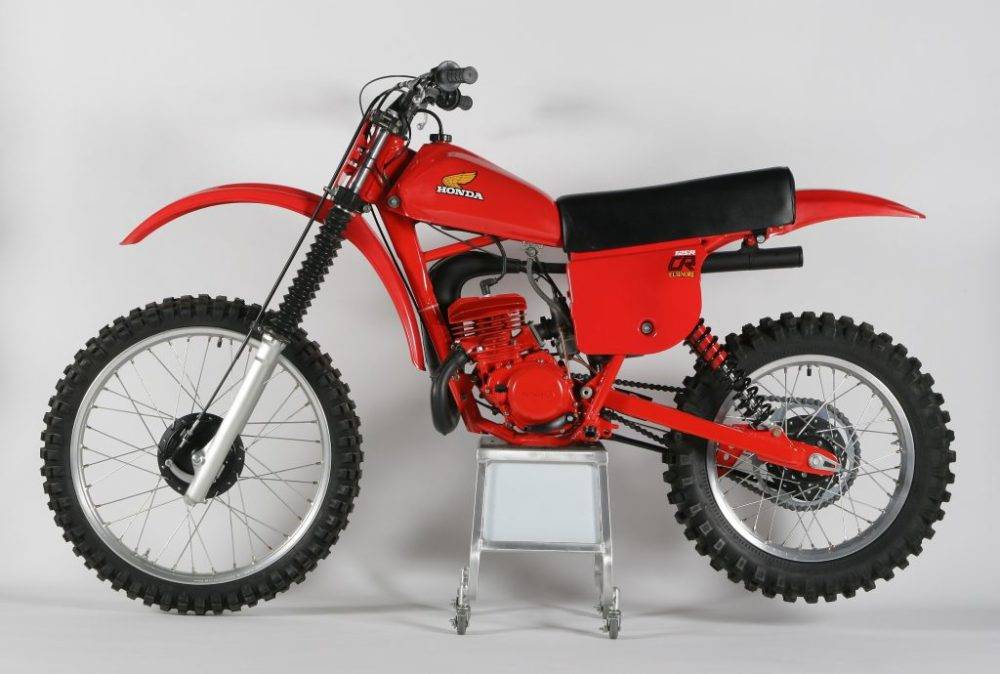 The CR125R’79 Elsinore was sold in 1979 in Tahitian Red. The engine was red; but the shock springs were black. The fork boots were black. The bike had a 23″ front wheel and an 18″ rear wheel. The engine was a 2-stroke reed valve single cylinder displacing 124cc linked to a 6-speed transmission. The serial number began JE01-2000010.
