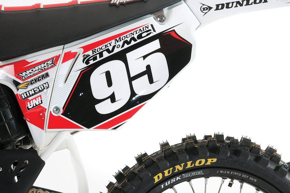 На данный момент наша Honda CR1995 125 года была золотой. Это бежало, структура была отремонтирована, и вилки были первоклассными. Чтобы застегнуть его, мы сделали несколько других обновлений: (1) Более широкие титановые подножки Raptor (для KTM); (2) Алюминиевая крышка зажигания CR2007 125 года (вместо старой пластиковой); (3) Номерные знаки НЛО, которые мы режем, чтобы создать современный образ; (4) Тростниковая клетка Moto Tassinari V-Force; (5) Переднее крыло Cycra и номерной знак стадиона; (6) Новые диски сцепления и пружины; (7) FMF труба и глушитель; (8) Графический набор DeCal Works; (9) Шины Dunlop MX32.