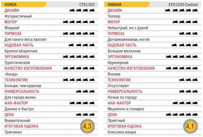Не надо ездить на этих мотоциклах неделями, чтобы понять: ходовые качества у них несравнимые. В чём V4 может опередить V2? Практически во всём. Разгон, максимальная скорость, вибрации, то есть практически все параметры мотора лучше у CTX1300. Но потом ты пересаживаешься на XVS1300 и понимаешь, что счастье не только в лошадиных силах. Неторопливые движения гигантских поршней и шатунов так массируют организм и услаждают слух пульсированием выхлопа, что ты готов простить скромную динамику и сочувственно смотреть на исчезающий вдали CTX1300, водителю которого недоступно твоё просветление.
