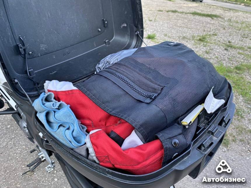 Есть и штатные кофры под этот мотоцикл, но тут стоит нештатный. Возможности перевозки вещей немалые.