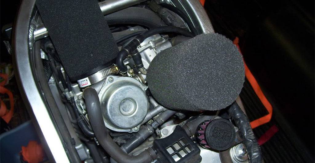 By modern standards the Hawk GT’s OEM air box is laughably small, dramatically limiting how much air can get into the Hawk motor. We tried removing the snokels, drilling holes in the top of the airbox and removing the top of the airbox all together, but we got the most out of the Hawk and the best overall results with the stage-3 kit that replaced the entire air-box in favor of the foam pod filters that bolt directly to the carburetors.
