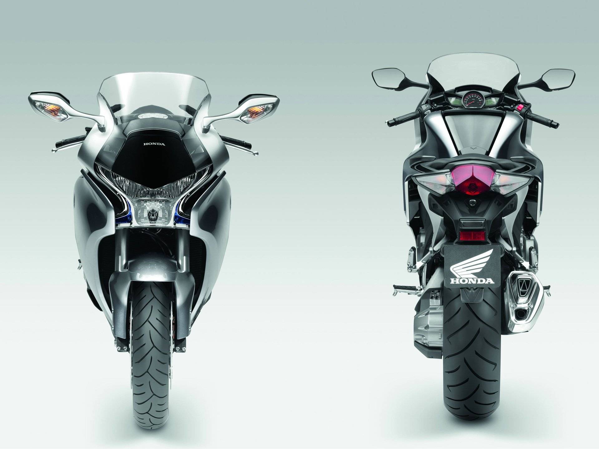 Хонда VFR 1200F особенно ярко смотрится при вишневом окрасе рамы, который сочетается с серебристыми элементами сзади и с изобилием черного цвета посередине. Колесные диски литые, все элементы в них выглядят гармонично и не обладают крупными размерами. Иногда складывается впечатление, что диски спицованные, если мотоцикл едет на небольшой скорости.