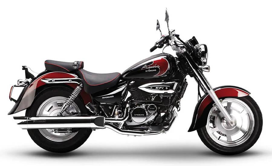 Этот байк больше подойдет для покупки новичками. На сегодня цена Хюсонг Акила 250 в русских салонах составляет около 200 000 руб., что дороже аналогов из Китая минимум на треть. В нем установлен инжекторный V-образный двухцилиндровый двигатель на 250 кубов с воздушно-масляным охлаждением, который выдает 24,9 л. с. при крутящем моменте 20 Н·м и 7000 об/мин.