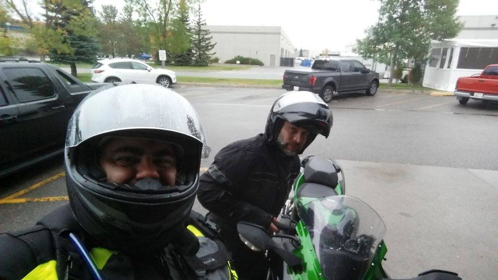 We rode for about 45 minutes and stopped in a small town east of Calgary. I was testing out a new Olympia X Moto 2 Jacket and Pant combo and I was not cold; however, my gloves were not up to the task. My hands were drenched and it was a bit discerning to see my left index finger as blue as if I had been eating blueberry pie.