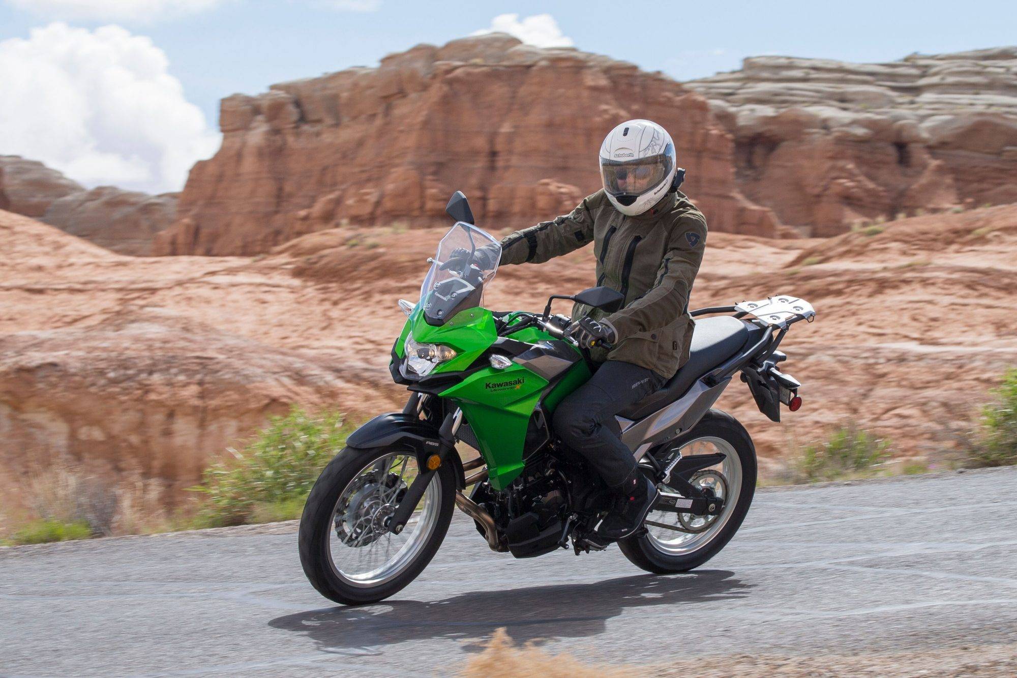 Up to about 60 mph, its big brother the KLR650 would probably beat it in a drag race but the pesky little Versys-X 300 keeps accelerating, continuing to build speed until it eventually catches up. On one speed run we clocked 104 mph on the speedo, something we’ve never seen on the KLR. Needless to say, this bike leaves its 250cc thumper counterparts in the dust. Even more impressive, it can carry speed. On two occasions, we crossed over mountain passes starting at around 7,000 feet climbing to nearly 10,000 feet in elevation. All the time, the Versys-X 300 had enough torque to cruise in 6th gear without the need for a downshift and the power loss from the elevation gain was minimal.
