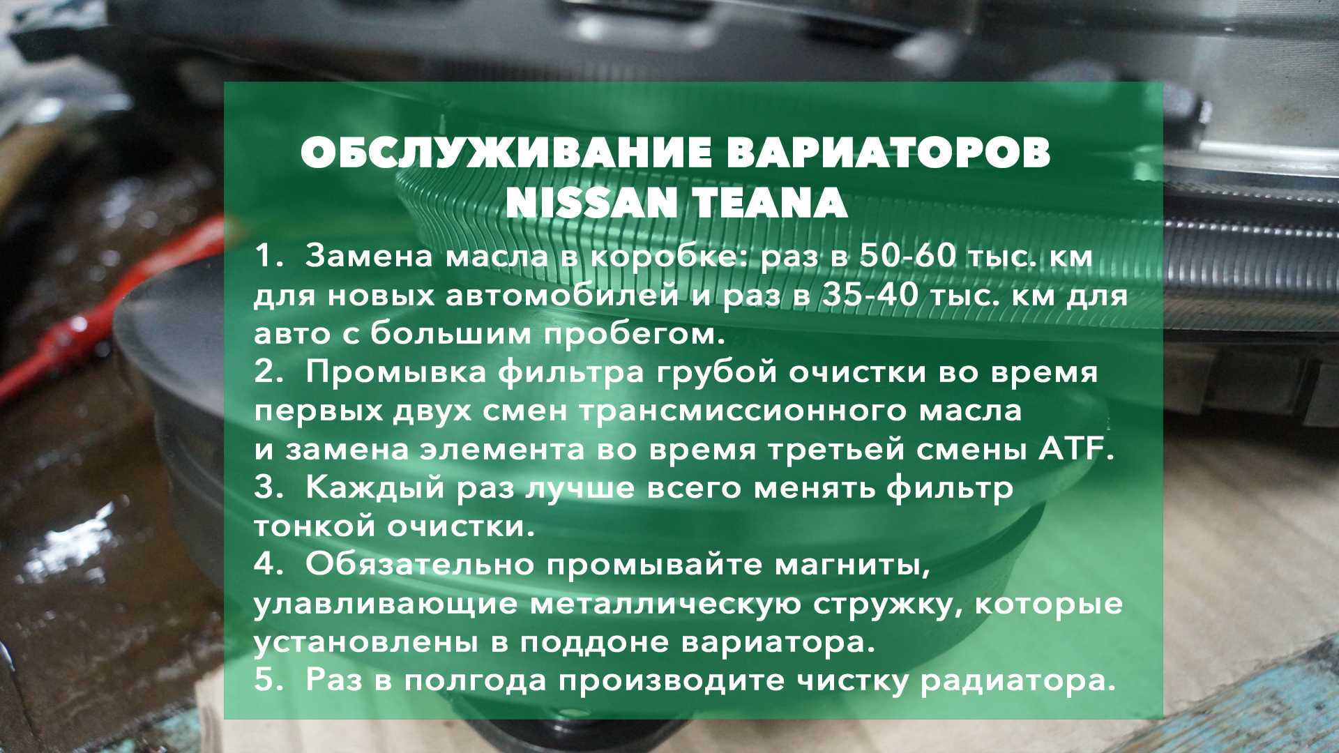 Правильная эксплуатация и соблюдение предписаний изготовителя по ходу за коробкой – основа продолжительной службы вариатора и его полной выработки ресурса. Ресурс вариатора Ниссан Теана 2.5, 3.5 исчисляется сотнями тысячи километров дороги. Но без помощи автовладельца коробка просто-напросто не сможет реализовать весь заложенный в неё потенциал. Правильно относиться к коробке седана нужно с первых дней эксплуатации. Во-первых, перед началом движения обязательно стоит прогревать и двигатель, и вариатор. Особенно важны прогревы в зимнее время после длительных простоев. После прибытия на место назначения не нужно сразу глушить двигатель. Необходимо дать некоторое время мотору с коробкой остыть, нормализовать температуру в системе. Во-вторых, избегайте нагрузок. По-возможности вообще любых. Машина с вариатором – не лучший транспорт для гонок и покорения бездорожья. Только спокойная, умеренная эксплуатация машины в условиях города.