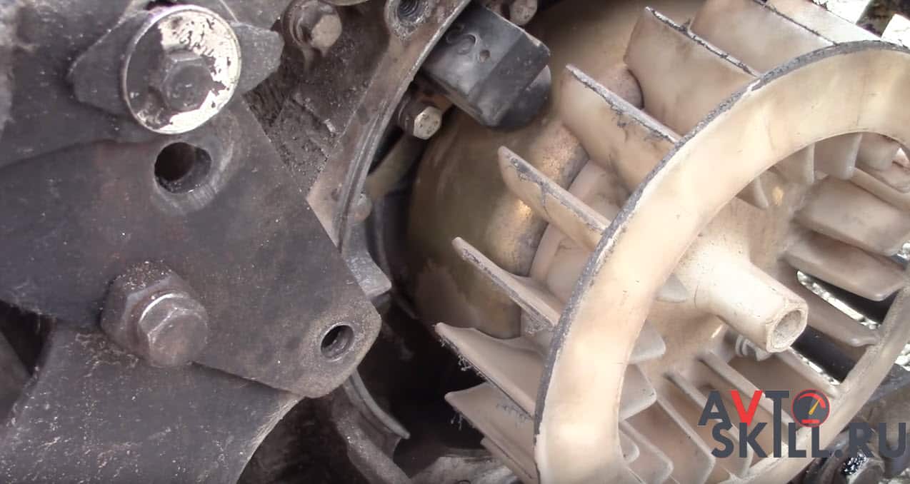 Для поиска ВМТ снимаем облицовку вентилятора для генератора. Ключом на 13 поворачиваем по часовой стрелке шестигранник на крыльчатке охлаждения генератора до тех пор, пока риска на маховике генератора с меткой «Т» не совпадёт с выступом, что сбоку маховика.