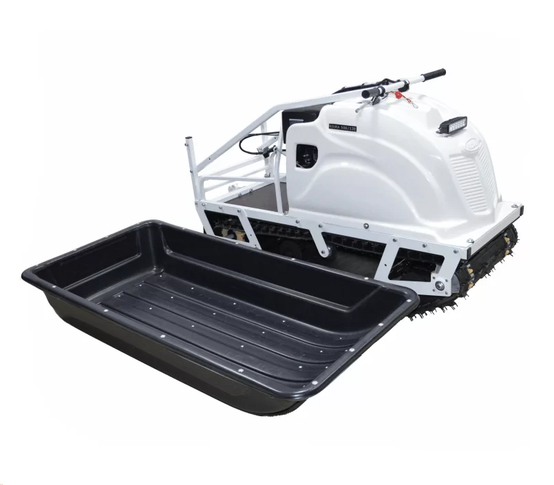 Мотор запускается мгновенно вне зависимости от погодных условий, что обеспечивается ручным стартером. Модель компактна, но имеет относительно мощный двигатель (7 л.с.) и грузоподъемность до 200 кг. Колебания оперативно гасятся демпферной подвеской, что упрощает управление и заметно повышает устойчивость. Вместе с санями модель весит лишь 50 кг.