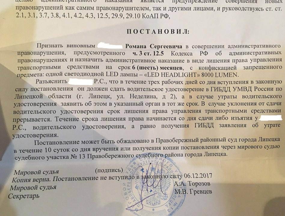 Вот вам фото судебного решения – прав за светодиодные лампы не лишат, но нервы потреплют.