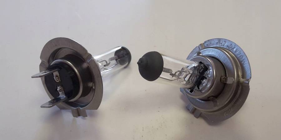 Лампу Н7 легко отличить по широкой юбке с вырезом и двум выступающим контактам.