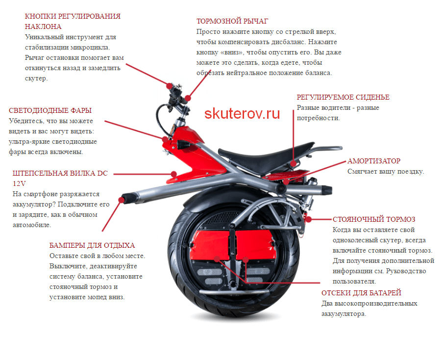 Глядя на монобайк, приходишь в полнейших восторг от смекалки и воображения его создателей, сумевших максимально облегчить конструкцию, убрав всю «начинку» скутера вовнутрь его единственного колеса. Этот нехитрый прием позволил также решить проблему дефицита водительского места, сместив центр тяжести мотоцикла. К тому же наличие регулируемого седла