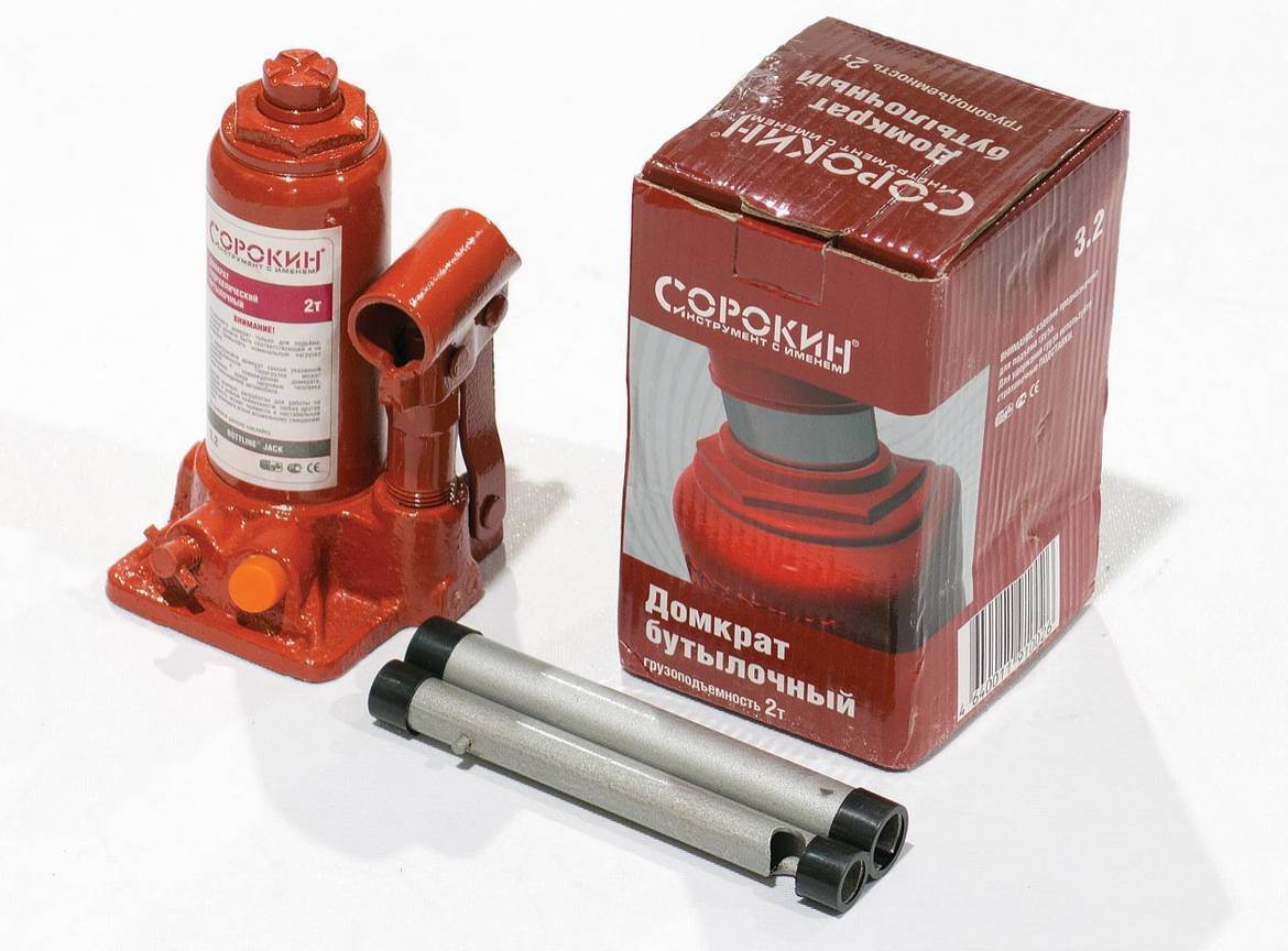 Ручка и домкрат разного цвета. Домкрат — темно-красный, ручка — серебристая, складывается из двух трубок, имеет на малой трубке вырез, при виде которого возникает ассоциация, что это открывашка для пива, — другого применения этого выреза к домкрату обнаружить не удалось. Внутри фирменной коробки лежит подробный паспорт изделия.