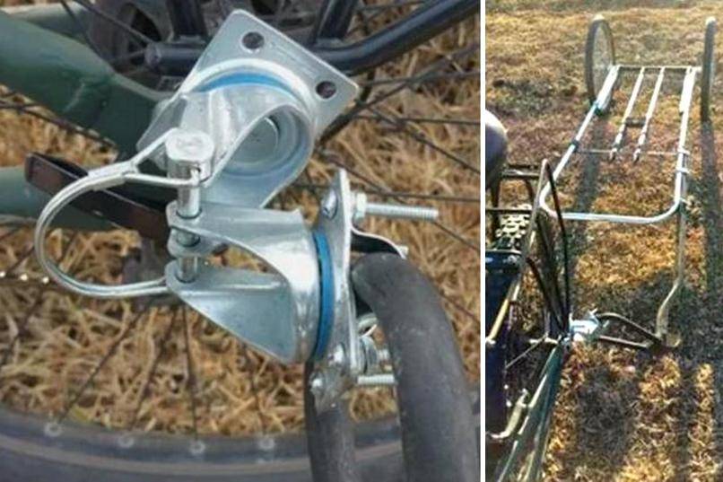 Оригинальная идея – изготовить велосипедный фаркоп из двух мебельных опор высотой 60 мм. Ролики из них удаляются, и один элемент крепится болтами с гайками к задней вилке велосипеда.