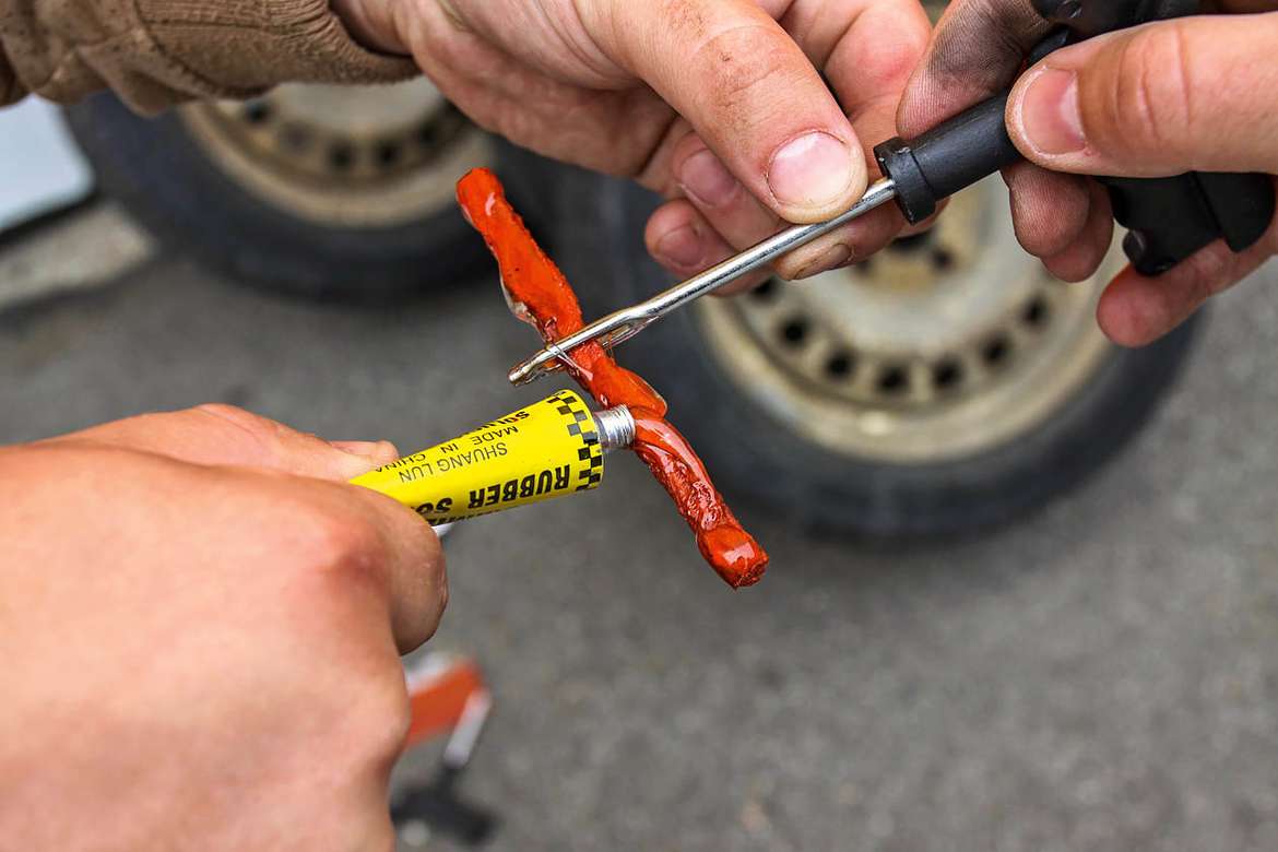 Чтобы устранить место прокола, нужно вставить жгут, на который нанесен клей. Для этого необходимо подготовить отверстие в резине. Перед вытаскиванием металлического предмета из шины, подготовьте рашпиль. На металлический штырь инструмента необходимо нанести клей из тюбика. Только после этого можно приступать к удалению гвоздя или самореза.