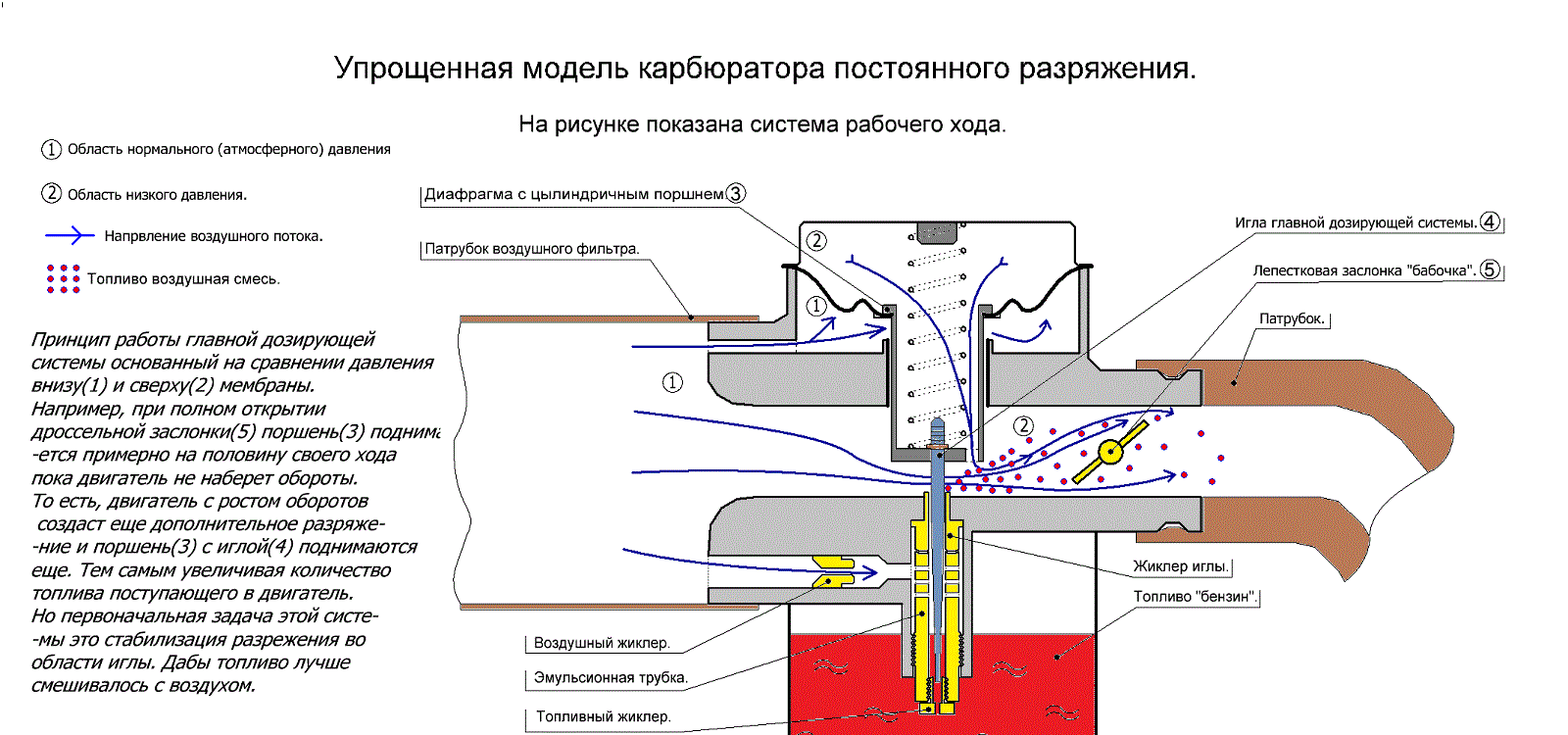 Характерное сужение трубки способствует образованию низкого давления воздуха, которое выравнивается к месту расширения трубки. Если внутри данной трубки расположить еще одну трубку меньшего размера с бензином, то, бензин по пути в зону пониженного давления начнет покидать маленькую трубку, при этом распыляясь и улетучиваясь, взаимодействуя с потоком воздуха внутри большой трубки.