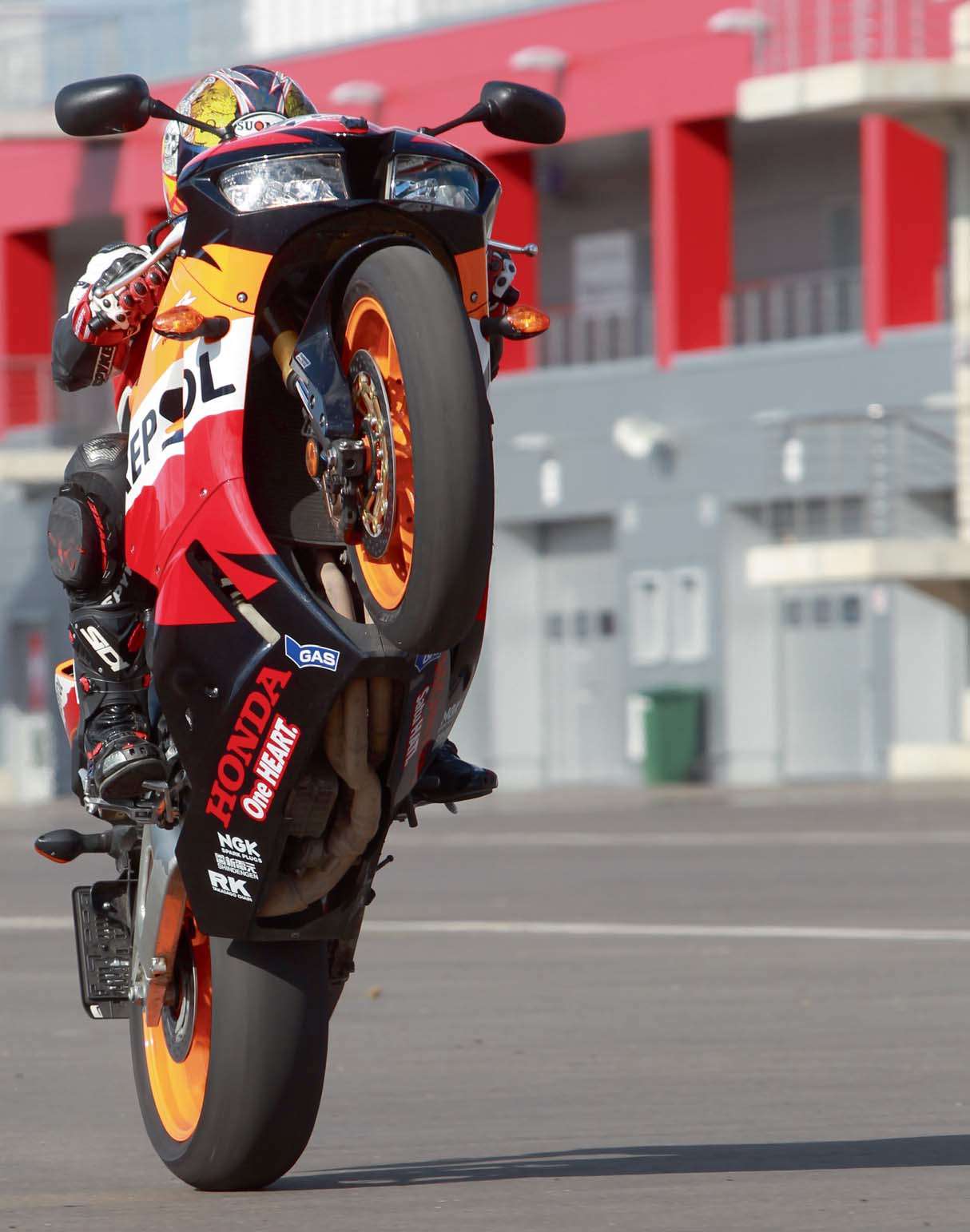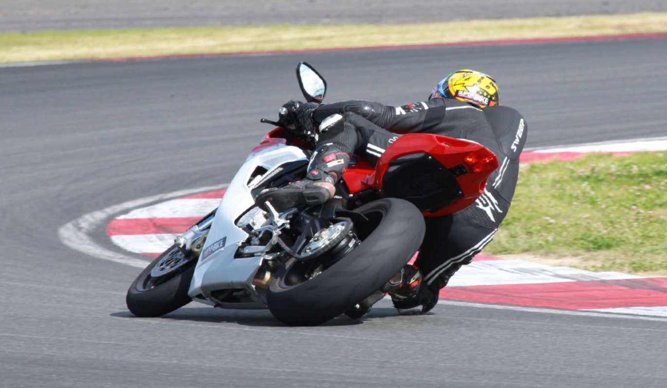 Несмотря на то что тестовый F3 был единственным мотоциклом из всех участвовавших в сравнении аппаратов, который не получил гоночные слики, а «выступал» в свободной категории на стандартных покрышках, сложностей с контролем сцепления шин с полотном трека и «отловом» момента срыва в поворотах не было. Можно подумать, что это заслуга трекшнконтроля, которым, напомню, итальянский спортбайк оборудован в стандартной комплектации, в то время как для японских визави эта система недоступна в принципе. Однако позволю себе усомниться в эффективности «стокового» трекшн-контроля, который на тестовом F3 был выставлен в самый «щадящий» режим, в котором система почти не вмешивалась в процесс управления мотоциклом. Мотоцикл Honda, получивший в 2013 году обновленную вилку Showa BPF и полностью регулируемый моноамортизатор той же марки,— определенно, самый стабильный и подконтрольный из всей тройки сравниваемых машин, что более чем гармонировало с дружелюбным характером мотора CBR600RR!