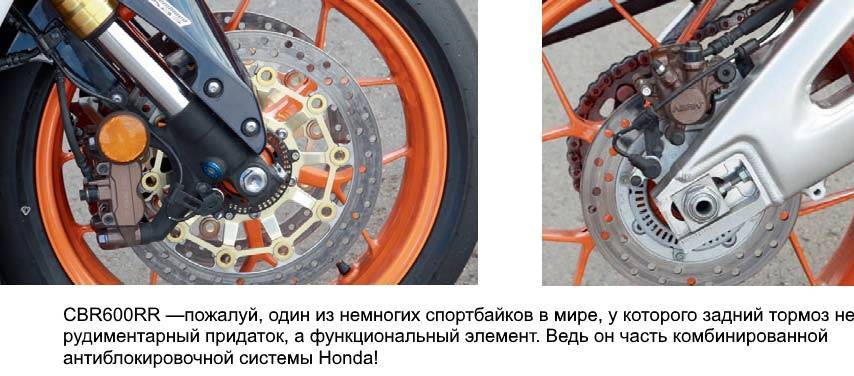 Думаю, комментарии тут излишни. Honda CBR600RR — единственный из тестовых аппаратов, который был оснащен ABS. И, конечно, не простой, а комбинированной, которую японский концерн использует, кажется, на всех мотоциклах, за исключением кроссовых и эндуро моделей (хотя и до них, я уверен, когда-нибудь доберется…). Несмотря на не самые эффективные передние 4-поршневые скобы Tokico, наличие антиблокировочной системы существенно упрощает контроль над процессом торможения, и, разумеется, делает его динамичнее. В пресс-релизах, посвященных обновлению модели CBR600RR, говорится, что японские инженеры немало поработали над управляющей электроникой C-ABS и сделали ее лояльнее к моменту срыва колес, чтобы система не мешала пилоту управлять мотоциклом на гоночном треке… Но это все-таки не так. Работа ABS ощутима почти при каждом торможении, что особенно хорошо заметно еще и из-за отсутствия на CBR600RR пресловутого проскальзывающего сцепления. К сожалению, возможности настроить или хотя бы подстроить ABS на мотоцикле Honda нет, как это можно сделать, например, на BMW HP4… Но это, правда, совсем другой мотоцикл, с другой планеты и за другие деньги.